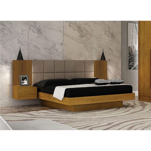 Particularidades da Cama: Características: - Fabricado em MDF; - Para colchão de 1,58m x 1,98m; - Painel estofado; - Mesa de cabeceira suspensa; - Corrediça telescópica;