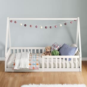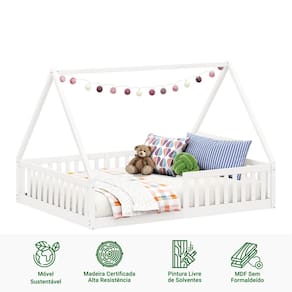 Imagine uma cama perfeita para seu filho brincar, descansar e estimular suas ideias. A Cama Casal Infantil Montessoriana Branco Ravi possui estilo com proteção lateral, estrategicamente projetada para promover segurança e estimular a independência e também que a criança fique junto com seu pai ou mãe ouvindo histórias e brincando antes de dormir. Seu design próximo ao chão cria um espaço acolhedor. O produto é de madeira maciça, garantindo resistência e durabilidade para a cama. O Cama Casal Infantil Montessori Ravi permite que você monte com abertura em ambos os lados e também é possível a remoção do telhadinho.