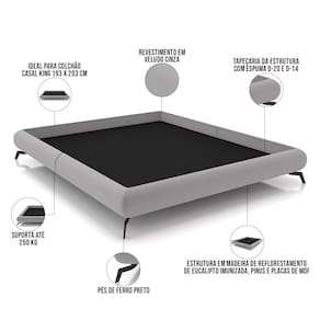 Cama Casal King Base Box Pés de Ferro Estilo Industrial 210cm Otto P05 Veludo Cinza - Lyam Decor