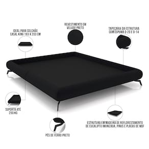 Cama Casal King Base Box Pés de Ferro Estilo Industrial 210cm Otto P05 Veludo Preto- Lyam Decor - Preto