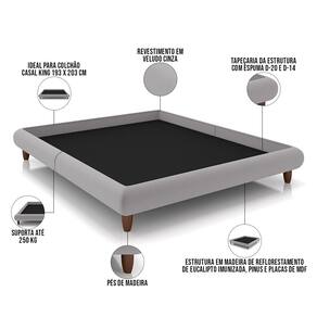 Características: Estrutura em madeira de reflorestamento de eucalipto imunizada contra mofo, cupim e micro-organismos, pinus e placas de MDF. Revestimento em Veludo na cor Cinza. Tapeçaria da estrutura com espuma D-20 e D-14. Ideal para colchão casal king 193 x 203 cm. Não acompanha colchão e cabeceira. Pés de madeira. Peso suportado: Até 250 kg.