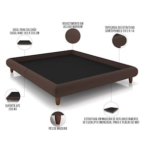 Características: Estrutura em madeira de reflorestamento de eucalipto imunizada contra mofo, cupim e micro-organismos, pinus e placas de MDF. Revestimento em Veludo na cor Marrom. Tapeçaria da estrutura com espuma D-20 e D-14. Ideal para colchão casal king 193 x 203 cm. Não acompanha colchão e cabeceira. Pés de madeira. Peso suportado: Até 250 kg.