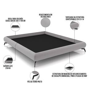 Características: Estrutura em madeira de reflorestamento de eucalipto imunizada contra mofo, cupim e micro-organismos, pinus e placas de MDF. Revestimento em Veludo na cor Cinza. Tapeçaria da estrutura com espuma D-20 e D-14. Ideal para colchão casal queen 158 x 198 cm. Não acompanha colchão e cabeceira. Pés de ferro preto. Peso suportado: Até 250 kg.