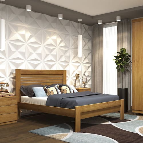 A Cama de Casal Safira da Tcil traz uma proposta ousada em sua cabeceira, criando um efeito moderno com a aplicação das peças em diagonal. Produzida com material de alta qualidade, possui estrutura em MDF com pintura U.V acetinada e acabamento texturizado e estrado em madeira reflorestada.