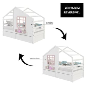Diferenciais: 02 Gavetas, Casinha com fechamento em MDF, Janela e Prateleira para Livros e Decoração, Montagem Reversível (Lado Direito ou Lado Esquerdo)