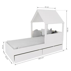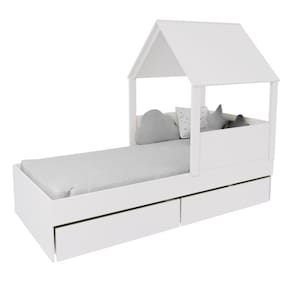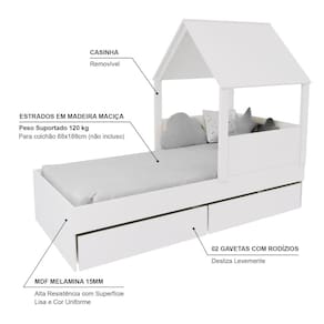 Diferenciais: MDF Melamina 15mm, Estrados em Madeira Maciça, 02 Gavetas com Rodízios, Casinha com Telhado.