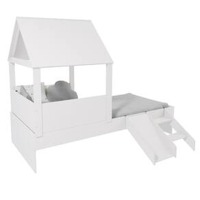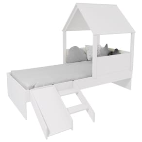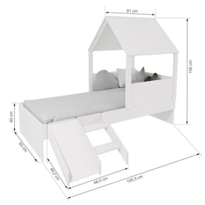 Diferenciais: MDF Melamina 15mm, Estrados em Madeira Maciça, Casinha com Telhado, Kit escada/ escorregador.