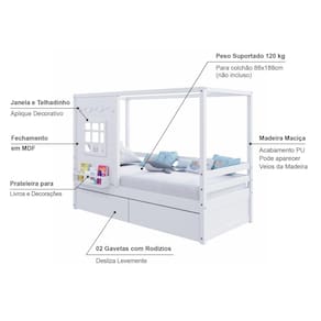 Diferenciais: 02 Gavetas, Casinha com fechamento em MDF, Janela e Prateleira para Livros e Decoração,Montagem Reversível (Lado Direito ou Lado Esquerdo)