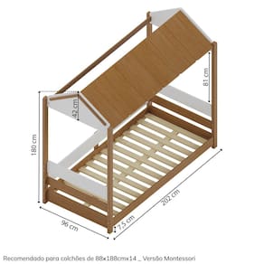 A Cama Casinha Solteiro Reversível Aria Casatema MadeiraOriginals é a materialização da liberdade de crescer, transformando o quarto em um universo de descobertas e aconchego. Nascida do encontro entre o design natural e a funcionalidade, esta peça é uma verdadeira casa de sonhos, que acompanha a evolução da criança. Sua estrutura 100% em madeira maciça de pinus com acabamento em verniz fosco nogueira e detalhes em MDF laqueado branco assegura a robustez e a Segurança Prioritária que tranquilizam os pais, sendo um investimento em Qualidade e Durabilidade. O grande diferencial é sua característica reversível: ela pode ser montada na altura montessoriana baixa, incentivando a autonomia desde cedo, ou na altura tradicional, conforme a criança cresce. Este Toque de Sofisticação e Aconchego, com seus contornos suaves e toque artesanal, garante que o quarto deixe de ser apenas um lugar de dormir e se torne um refúgio acolhedor, onde a poesia do design convida a brincar e sonhar com leveza. Acompanha Cama Auxiliar: Não Acompanha Colchão: Não Altura do Estrado até o Chão: 30,5 cm Ambiente Principal: Quarto Infantil codigo_ean: 7900288269287 Complexidade da Montagem: Média: pode ser montado por mais de uma pessoa e/ou necessite de maior conhecimento para montagem Cor: Nogueira/Branco Cor do Produto: Nogueira/Branco Escala de Brilho: Semi-Fosco Itens Inclusos: 1 Cama Casinha, Manual de Montagem e Kit Ferragens Linha ou Coleção: Aria Manual de Montagem e Instalação: https://product-hub-prd.madeiramadeira.com.br/927551923/documents/50e92e3f-9e0d-44dc-8438-ce4fb80e260c3288854338717611598171864.pdf Marca: Casatema Material do Estrado: Madeira Maciça Material Principal: Madeira Maciça modular: Não Montagem Flex: Pode ser montado como cama padrão ou montessoriana Necessita Montagem: Sim Origem do Produto: Nacional Permite a Utilização de Cama Auxiliar: Sim Peso: 58,5 kg Possui Baú: Não Possui Gavetas: Não Possui Pés: Não Possui Portas: Não Possui Prateleiras: Não Possui Telhado: Sim Recomendações de Uso, Manutenção e Limpeza: Na limpeza não utilizar produtos químicos e abrasivos, usar apenas um pano umedecido, para garantir a maior durabilidade do móvel. Sistema de Montagem: Parafusos, cavilhas e porcas Suporta Até (kg): 100 kg Tamanho do Colchão Indicado (L x C): 188cm x 88cm Tipo de Cama: Cama Casinha Tipo de Colchão: Solteiro Tipo de Estrado: Fixo Tipo de Grade de Proteção: Grade Tipo de Madeira Maciça: Pinus