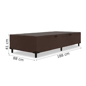 MARCA: Prince MODELO: Cama com Baú Solteiro 0,88 com 41cm de Altura Suede COR: Marrom MEDIDAS: A: 41 cm / 35 cm (sem pés) L: 88 cm P: 188 cm TECIDO: Suede PESO: 38kg PÉS: 6 ALTURA DOS PÉS: 6cm MATERIAL DOS PÉS: Plástico GARANTIA: 03 meses
