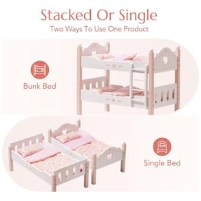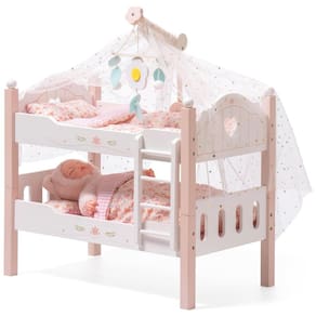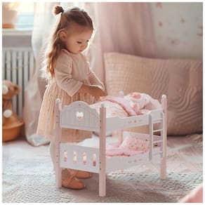 A Cama de Boneca ROBUD é um conjunto versátil de beliche projetado para montagem fácil, com escada removível, proporcionando uma versão em miniatura realista de uma beliche de tamanho completo. As crianças podem se divertir durante o tempo de brincadeira. Fácil de montar, pode ser facilmente montada por uma pessoa, sem a necessidade de ferramentas complicadas! Feita inteiramente de madeira, oferece resistência e durabilidade superiores em comparação com alternativas de plástico, garantindo anos de uso confiável. Seu design encantador combina funcionalidade com estética, com esquema de cores quentes e padrões de rosas encantadores, criando uma atmosfera mágica perfeita para estimular a imaginação. Medindo 55cm x 30cm x 46cm, oferece muito espaço para bonecas de até 50cm descansarem confortavelmente.