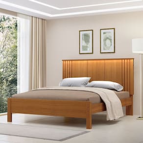 O estrado é extremamente reforçado, com ripas de MDF de 1,2 cm, cinco travessas de 2,5 cm e barras laterais também em MDF de 2,5 cm — espessuras superiores às normalmente utilizadas no mercado; os pés da cabeceira e da peseira possuem sapatas antiumidade.