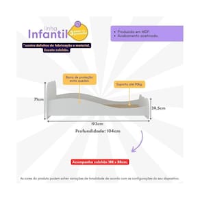 Conforto aliado à resistência Com capacidade para suportar até 90kg, combina segurança e conforto. Além disso, a cabeceira e a peseira em formato de nuvem trazem um charme especial para o ambiente, incentivando a imaginação e os sonhos. O manuseio da cama é seguro, já que as bordas são arredondadas. Além de tudo, acompanha colchão D23 macio e especialmente desenvolvido com tratamento antiácaro e antialérgico, tornando as noites de sono saudáveis e tranquilas.