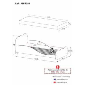 Especificações Técnicas: Dimensões da Cama Montada - Altura: 71cm | Largura: 193cm | Profundidade: 104cm Dimensões do Colchão - Altura: 12cm | Largura: 188cm | Profundidade: 88cm Material: 100% MDF (15mm) proveniente de reflorestamento Bordas Arredondadas: Sim Peso Máximo Suportado: 90kg Colchão Incluso: Sim Densidade do Colchão: D23 Conforto do Colchão: Macio