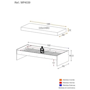 Dimensões do produto montado: Cama - Altura: 45,5cm | Largura: 192cm | Profundidade: 95cm Colchão - Altura: 12cm | Largura: 188cm | Profundidade: 88cm *Você pode consultar as medidas detalhadas na imagem técnica do produto.