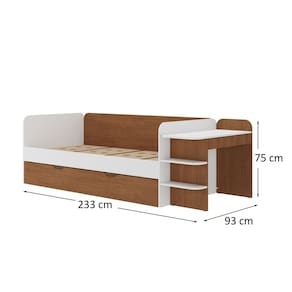 Com resistência, funcionalidade e acabamento refinado, a cama Helena transforma qualquer quarto infantil em um espaço acolhedor, bonito e organizado. Acabamento da Gaveta: Melamínico Acabamento da Prateleira: Melamínico Acompanha Cama Auxiliar: Sim Acompanha Colchão: Não Altura do Estrado até o Chão: 7,7 cm Ambiente Principal: Quarto Infantil Cama Auxiliar Acompanha Colchão: Não Cama Auxiliar com Rodízio: Sim Cama Auxiliar Suporta Até (kg): 80 kg codigo_ean: 7900288263605 Complexidade da Montagem: Média: pode ser montado por mais de uma pessoa e/ou necessite de maior conhecimento para montagem Cor: Branco/ Castanho Cor do Produto: Branco/ Castanho Cor Flex: Não Escala de Brilho: Fosco Escala de Brilho da Gaveta: Fosco Escala de Brilho da Prateleira: Fosco Extensível: Sim Gaveta com Chave: Não Itens Inclusos: 1 Cama Infantil, 1 Cama Auxiliar, 1 Escrivaninha, Kit de Ferragens e Manual de Montagem Largura Máxima: 186 cm Largura Mínima: 93 cm Linha ou Coleção: Helena Manual de Montagem e Instalação: https://product-hub-prd.madeiramadeira.com.br/189228182/documents/8abca81e-ff46-4ee7-8045-4f6afd2902833252532657817593273626899.pdf Marca: FD Material da Gaveta: MDF Material da Prateleira: MDF Material Principal: MDF modular: Não Montagem Flex: Não Necessita Montagem: Sim Origem do Produto: Nacional Permite a Utilização de Cama Auxiliar: Sim Peso: 90 kg Peso Máximo por Gaveta: 5 kg Peso Máximo por Prateleira: 5 kg Possui Baú: Não Possui Escrivaninha: Sim Possui Pés: Não Possui Portas: Não Possui Prateleiras: Sim Recomendações de Uso, Manutenção e Limpeza: Limpar somente com um pano levemente umedecido. Indicado para ambientes internos Sistema de Montagem: Parafusos, cavilhas e minifix Suporta Até (kg): 165 kg Tamanho da Cama: Solteiro Tamanho do Colchão Indicado (L x C): 88cmx188cm Tamanho do Colchão Indicado Cama Auxiliar: 88x188 Tipo de Cama: Bicama Tipo de Colchão: Solteiro Tipo de Corrediça da Gaveta: Metálica Telescópica Tipo de Estrado: Fixo Tipo de Puxador da Gaveta: Embutido