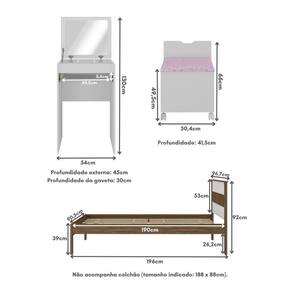 A Cama de Solteiro para Colchão 88 x 188 cm com Penteadeira 54cm e Puff Multimóveis CR40121 é a escolha perfeita para transformar seu quarto com conforto e estilo! Com estrutura em MDP (15/25mm) e acabamento em pintura UV, este conjunto garante resistência e durabilidade. Os estrados de madeira de eucalipto e as barras de MDP (25mm) proporcionam estabilidade, suportando até 130kg sem comprometer sua solidez. NÃO acompanha colchão (tamanho indicado: 188 x 88cm). A penteadeira possui 1 gaveta com puxador usinado e corrediças metálicas, proporcionando leveza no manuseio e mantendo seus itens sempre organizados. O design inteligente inclui 1 porta com pistão e espelho, criando um espaço perfeito para maquiagens. O toque final é o puff com tampo estofado e rodízios, que oferece conforto e praticidade ao movimentá-lo e encaixá-lo na penteadeira, otimizando seu ambiente. As opções de cores Amêndoa/Branco e Nogal/Branco possuem acabamento em BP e pintura UV.