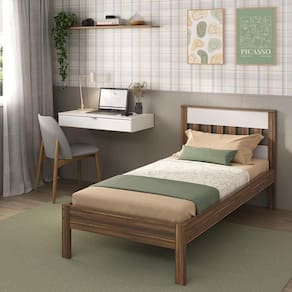 A Cama de Solteiro para Colchão 88 x 188 cm com Penteadeira 90cm Suspensa Multimóveis CR35248 é a escolha perfeita para transformar seu quarto com conforto e elegância! Com estrutura em MDP (15/25mm) e acabamento em pintura UV, o conjunto garante resistência e durabilidade. Os estrados de madeira de eucalipto e as barras de MDP (25mm) proporcionam estabilidade, suportando até 130kg sem comprometer sua solidez. NÃO acompanha colchão (tamanho indicado: 188 x 88cm). A gaveta espaçosa da penteadeira suporta até 3kg e é perfeita para acomodar maquiagens e acessórios. Experimente a suavidade das corrediças telescópicas, que proporcionam um manuseio silencioso e sem esforço. O puxador em alumínio escovado destaca-se pelo design minimalista, oferecendo um toque moderno no ambiente, enquanto o tampo suporta até 8kg, ideal para exibir itens decorativos. Com montagem suspensa, a penteadeira é uma peça-chave que redefine o conceito de sofisticação. As opções de cores Amêndoa/Branco e Nogal/Branco possuem acabamento em BP e pintura UV.
