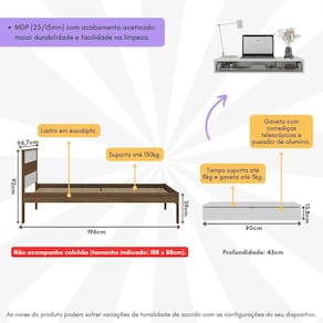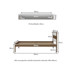 Dimensões do produto montado: Cama - Altura: 92cm | Largura: 196cm | Profundidade: 96,7cm Penteadeira - Altura: 13,8cm | Largura: 90cm | Profundidade: 45cm *Você pode consultar as medidas detalhadas na imagem técnica do produto.