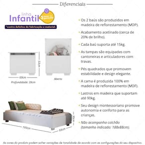 O conjunto acompanha 2 baús produzidos em MDP (15mm), com capacidade de até 15kg cada. As tampas são equipadas com cantoneiras e articuladores com travas, projetados para abrir com facilidade e segurança, evitando acidentes. Perfeito para guardar brinquedos, roupas ou acessórios sem perder a ordem no quarto.