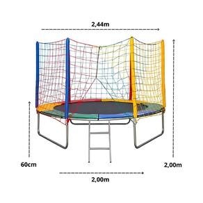 CAMA ELÁSTICA NACIONAL REDONDA MEDIDAS (VALORES APROXIMADOS): Diâmetro total: 2,44m Diâmetro lona de salto (gancho a gancho): 2,00m Altura total: 2,00m Altura do chão a lona: 60cm ESPECIFICAÇÕES: Estrutura em aço galvanizado; Acessórios com proteção UV; Sistema de impulsão por 48 molas; 3 pés em formato de U; Rede de proteção em polipropileno; Sistema de montagem do trampolim por encaixe; Suporta até 120 kg; Lona de salto; Protetor de Molas; Escada.