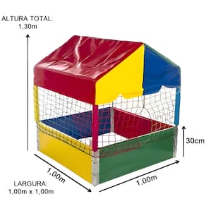 PISCINA DE BOLINHAS QUADRADA 1,00m x 1,00m MEDIDAS (VALORES APROXIMADOS): Largura: 1,00m Altura total: 1,30m Altura da tábua lateral: 30cm ESPECIFICAÇÕES: Estrutura em aço galvanizado; Acessórios com proteção UV; Rede de proteção em polipropileno; Sistema de montagem por encaixe; Revestida com isotubos blindados.