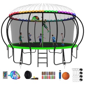 Jump Higher Jumper Happier With a LED trampoline light, sprinkler, meias, very suit for a family to play in the trampoline. 4 peças de pernas em forma de U 8 pontos de contato equilibrados fornecem uma base estável para pular. 80pcs molas tapete de salto de alta densidade fornecem energia para saltar. Será uma plataforma segura para Saltar, Dançar e Ler. Oferecendo a você uma sensação de paz enquanto joga no tatame.