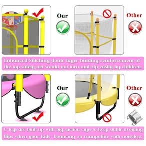 ROBUSTO Estrutura de aço à prova de ferrugem com um total de 3 pernas em forma de U para maior estabilidade e salto impressionante. Cada pé em forma de U é ajustado com duas ventosas grandes, o que melhora a estabilidade e não danifica o piso. Não vai chacoalhar ou tremer quando as crianças pequenas pularem. As estruturas de aço resistentes são mais pesadas do que outras, o que significa muito mais robustez e segurança, os tubos resistentes à ferrugem não quebram para uso a longo prazo. SEGURANÇA A almofada de salto resistente ao desgaste e resistente aos raios UV feita de PP pode suportar alta pressão e tem boa elasticidade. A estrutura de malha completamente visível cria um ambiente de salto e agradável. O reforço aprimorado da camada dupla de costura da rede de segurança superior não seria rasgado e rasgado facilmente pelas crianças. Diversão dupla com ações de salto e tiro com a cesta de basquete de entretenimento integrada. CARGA PESADA Este trampolim de com compartimento de segurança para crianças pequenas é e estável. O trampolim infantil com rede de proteção garante a segurança do seu filho ao pular. almofadas de estrutura duráveis. Todos os trampolins VGMiu são totalmente testados quanto à segurança e durabilidade APLICAÇÃO O trampolim recém atualizado em 2021 é o melhor presente para as crianças. É muito adequado para crianças, bebês, seus filhos podem se divertir muito e pular exercícios no trampolim VGMiu, uma ótima maneira de queimar energia extra a qualquer hora do dia. Pode ser instalado em ambientes internos, externos, jardim ou quintal. Realmente um brinquedo de trampolim criativo para crianças internas, externas