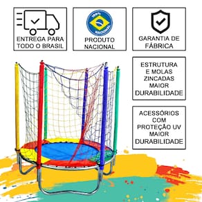 Cama Elástica (Pula-pula) Medidas: 1,40m - Redonda ESPECIFICAÇÕES: - Estrutura em aço galvanizado, não enferruja nem descasca.; - Sistema de impulsão por 24 molas; - 3 pés inteiros em “U”; - Rede de proteção em polipropileno multicolorida; - Sistema de montagem do trampolim por encaixe (fácil de montar); - Suporta até 30 kg; - Altura total: 1,57m - Lona de salto; (A cor varia de acordo com a disponibilidade do estoque, não é possível escolher a cor da lona); Garantia de 3 meses conta defeito de fabricação, Imagem meramente ilustrativa.