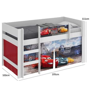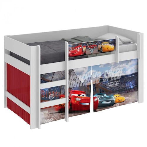 É hora da brincadeira! Com a cama carros Disney play seu filho terá aquele soninho bom e muita diversão nas pistas com o relâmpago mcqueen. Além de muita segurança a cama oferece proteção lateral e espaço na parte inferior para brincar e guardar os brinquedos. Acabamento: Pintura Acabamento dos Pés: Pintura Acompanha Cama Auxiliar: Não Acompanha Colchão: Não Acompanha Dossel: Não Acompanha Móbile: Não Acompanha Suporte para Mosquiteiro: Não : 111 cm : 111 cm do Estrado até o Chão: 73 cm dos Pés: 73 cm Ambiente: Quarto Infantil Complexidade da Montagem: Média: pode ser montado por mais de uma pessoa e/ou necessite de maior conhecimento para montagem Cr: Branco Cr: Branco Cr Predominante: Branco Escala de Brilho: Semi-Brilho Itens Inclusos: 1 cama : 103 cm : 103 cm Material do Estrado: Mdf Material dos Pés: MDF Material Principal: MDF Necessita Montagem: Sim Permite a Utilização de Cama Auxiliar: Não Peso: 40,9 kg Possui Gavetas: Não Possui Pés: 04 Possui Portas: Não Possui Prateleiras: Não Possui Rodízio: Não : 195 cm : 195 cm Recomendações de Uso, Manutenção e Limpeza: Limpar com pano umedecido e em seguida um pano seco. Não usar produtos abrasivos. Rodízio com Trava: Não Sapatas Niveladoras: Não Sistema de Montagem: Parafusos, porcas plásticas , pregos e cavilhas. Suporta até (kg): 120 kg Tamanho: Tamanho do Colchão Indicado (L x C): 188cm x 88cm Tipo de Cama: Convencional Tipo de Colchão: Solteiro Tipo de Estrado: Fixo