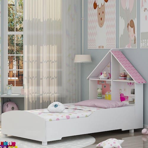 Cama casinha 090A Cama Casinha foi desenvolvida especialmente para o público infantil feminino. Além do conforto, que é essencial, ela foi pensada para ser também a diversão das meninas. Com estrutura e design em formato de casinha, possui arte impressa decorativa que simulam uma casa de brinquedo. As divisórias servem tanto como prateleiras de apoio, quanto para brincar de bonecas.
