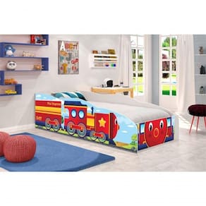 Fabricado em MDF e com pintura especial UV, a cama conta com bordas arredondadas e laterias que funcionam como grade de proteção. Os adesivos são feitos em