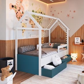 A Cama Infantil Montessoriana Casinha Solteiro Menino Menina com Proteção Lateral e Gavetas com Rodas da Completa Móveis traz um conceito Montossori lúdico com o conceito para estimular a autonomia e aperfeiçoar o potencial criativo das crianças desde a primeira infância. Com grades laterais de proteção e com cantos arredondados, propicia mais para o seu pequeno.
