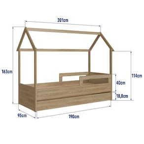 A Cama Infantil Montessoriana possui as seguintes dimensões: 201cm de largura, 163cm de altura e 95cm de profundidade. O colchão indicado tem as medidas de 188cm x 78cm. O estrado fica a uma altura de 21cm do chão e suporta até 80kg em cada cama. Além disso, o estrado possui uma regulagem de altura e os suportes dos lastros são feitos em madeira maciça, garantindo estabilidade e segurança.