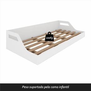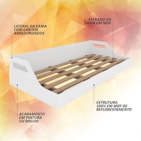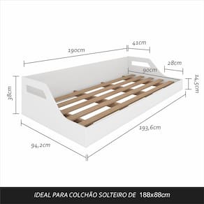 Detalhes Técnicos: MDF 18mm Acabamento: Pintura UV Brilho Borda: PU Tonalidade: Branco Estrado: em MDF 25mm Peso suportado: suporta até 100kg distribuídos Ideal para colchão Solteiro de 188x88cm Possui colchão: NÃO