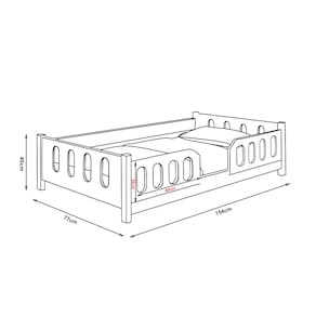 MEDIDAS DA CAMA: Comprimento: 154 cm Largura: 77 cm Altura: 45 cm Altura da grade de proteção: 25 cm Comprimento da grade de proteção: 60 cm