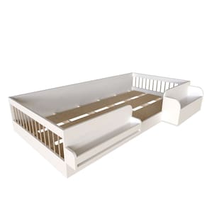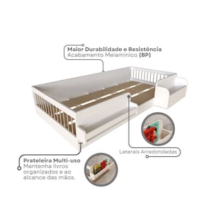 As grades em pinus natural completam o visual com um toque leve e acolhedor, harmonizando com qualquer estilo de decoração. Acabamento da Prateleira: Melamínico Acompanha Cama Auxiliar: Não Acompanha Colchão: Não Acompanha Grade de Proteção: Sim Altura do Estrado até o Chão: 35 cm Ambiente Principal: Quarto Infantil codigo_ean: 7900288279866 Complexidade da Montagem: Média: pode ser montado por mais de uma pessoa e/ou necessite de maior conhecimento para montagem Cor: Branco Cor do Produto: Branco Escala de Brilho: Fosco Escala de Brilho da Prateleira: Fosco Itens Inclusos: 1 Cama, Manual de Montagem e Kit Ferragens Linha ou Coleção: Tamiê Manual de Montagem e Instalação: https://product-hub-prd.madeiramadeira.com.br/298899353/documents/7eee9075-c862-4d3d-a374-b57262ad22a53300616522817617693570986.pdf Marca: Bramov Móveis Material da Prateleira: MDF/MDP Material do Estrado: MDF Material Principal: MDF/MDP modular: Não Necessita Montagem: Sim Origem do Produto: Nacional Permite a Utilização de Cama Auxiliar: Não Peso: 29 kg Peso Máximo por Prateleira: 2 kg Possui Baú: Sim Possui Escrivaninha: Não Possui Gavetas: Não Possui Pés: Não Possui Portas: Não Recomendações de Uso, Manutenção e Limpeza: Limpar apenas com pano macio levemente umedecido. Sistema de Montagem: Parafusos, Cavilhas e Minifix. Suporta Até (kg): 90 kg Tamanho da Cama: Solteiro Tamanho do Colchão Indicado (L x C): 88cm X 188cm Tipo de Cama: Montessoriana Tipo de Colchão: Solteiro Tipo de Estrado: Fixo Tipo de Grade de Proteção: Grade