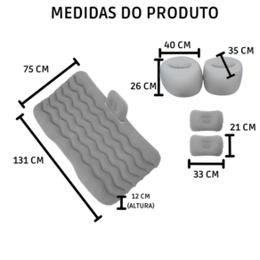 Conteúdo da Embalagem: - 1 Colchão de ar inflável veicular; - 2 Apoios para colchão; - 2 Travesseiros infláveis; - 1 Bomba de ar elétrica – com tomada acendedor. - 1 Folha de reparos; - 1 Bisnaga de cola.