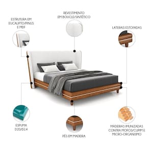 Crie um ambiente aconchegante e sofisticado no seu Quarto com a Cama King 195cm Com Cabeceira Many P02 Bouclê Off/Caramelo, da Mpozenato.Sua estrutura é fabricada em madeira reflorestada, unindo pinus, eucalipto e MDF, tratados especialmente contra mofo, cupim e micro-organismos. O travamento estrutural é assegurado por grampos, fixados com grampeadores pneumáticos, o que garante resistência e uma vida útil prolongada. A Cabeceira e a Base Box possuem estofamento em espuma D-20 e D-14, proporcionando um conforto único. Com revestimento de altíssima qualidade, essa Cama é ideal para noites de sono revigorantes e momentos de relaxamento. Além disso o design bipartido da base facilita tanto o transporte quanto a montagem, tornando tudo mais eficiente. Os pés em madeira conferem charme e elegância, elevando a decoração do seu Quarto Casal com um toque acolhedor e repleto de estilo.Adicione em seu carrinho de compras e garanta agora mesmo! Especificações Dimensões do ProdutoLargura: 250 cm. Altura: 110 cm. Profundidade: 230 cm. Peso: 82 Kg. IDEAL PARA COLCHÃO DE CASAL KING 193X203CM.NÃO ACOMPANHA COLCHÃO.Outras medidas (LxAxP)Medidas da Cama: 203x28x209 cm.Medidas Internas da Cama: 194x6x204 cm.Medidas da Cabeceira: 250x110x42 cm.Características do ProdutoMaterial da estrutura: Madeira de Eucalipto/MDF 6mm. Densidade da Espuma: Espuma D-20/D-14. Revestimento: Bouclê/Sintético. Peso Suportado: 300 Kg distribuídos. Possui Pés: Sim. Material dos Pés: Madeira. Altura dos Pés: 13cm. Possui Rodízios: Não. É Bipartido: Sim. Acompanha Colchão: Não. Acompanha Cabeceira: Sim. Diferenciais: - Design moderno. - Imunização contra mofo, cupim e micro-organismos. - Cabeceira estofada com espuma D-20 na estrutura e D-14 nos adornos laterais. - Cama com lateral estofada. - Pés de madeira. Sistema de Montagem: Parafusos. Manual de Montagem: Não. Complexidade da Montagem: Baixa. Conteúdo da Embalagem: 1 Cama. Volumes: 3 Volumes. do Fabricante: 90 dias contra defeitos de fabricação. Montagem: Recomendamos que seja feita por um . Recomendação de limpeza: Utilize pano levemente úmido. As dimensões do estofado estão sujeitas a uma variação de até 3 cm.A tonalidade do produto pode apresentar pequenas diferenças devido às variações de lote do tecido.Observações importantes:- Produto para uso residencial em ambiente interno, não devendo ficar exposto diretamente ao sol, calor e umidades excessivas.- As imagens são meramente ilustrativas, não acompanham objetos de decoração e eletrônicos.- Confira o estado da embalagem, não devendo assinar o comprovante em caso de danos.- Não asseguramos, no ato da , por subir escadas/elevadores, pelo transporte por guincho em apartamentos ou montagem, desmontagem e instalações. Eventuais despesas são por conta do comprador.- Confira as dimensões do produto e certifique-se de que passará normalmente por supostos elevadores, portas, escadas e/ou corredores de sua residência.