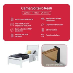 Cor: Branco | Fabricante: Móveis Lopas | Marca: Lopas | Modelo: Reali | Tonalidade: Branco | Tipo de produto: Solteiro | Garantia: 3 meses | Materiais da estrutura: Produto em MDF/MDP | Requer montagem: Sim | Largura x Profundidade x Altura: 99 cm X 209 cm X 119 cm | Tamanho da Cama: Solteiro