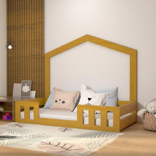 Cama Montessoriana com Casinha Play Marrom. Traz a filosofia montessoriana, oferecendo liberdade e autonomia para a criança com um toque a mais de modernidade. A Linha Play possui elementos que proporcionam maior praticidade e deixam o ambiente clean e alegre. Possui estrutura reforçada, sendo utilizado MDF de 2,5cm e madeira maciça em sua fabricação, proporcionando maior durabilidade para o móvel. A pintura laca traz o acabamento de alto padrão. Utilizado colchão padrão solteiro (1,88x0,88mt). Casinha montessoriana montada na parede, proporcionando maior espaço no quarto. Disponível sem casinha. Pode ser adquirida nas versões Bicama e Casal. Marca: Timber