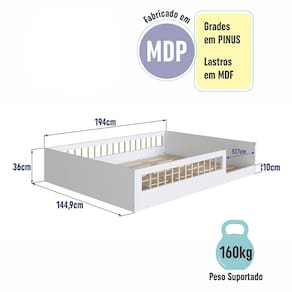 Características Estrutura em MDP Acabamento Fosco Estrado Lastros em MDF cru Grades em Pinus Protetor com Montagem Direita / Esquerda Cantoneiras de Proteção em Silicone Suporta até 160 kg sem Impacto IDEAL PARA COLCHÃO 188 X 78cm NÃO ACOMPANHA COLCHÃO