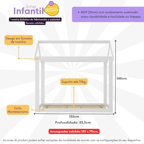 A Cama Montessoriana Infantil Bambolê com Colchão Incluso Multimóveis EX4011 é a escolha perfeita para transformar o quarto do seu pequeno em um verdadeiro lar de aventuras. Com um encantador design em formato de casinha, essa cama não apenas oferece um espaço confortável para dormir, mas também estimula a imaginação e a diversão das crianças. Produzida em MDP (15mm), a cama garante durabilidade e segurança, enquanto seu acabamento acetinado (cerca de 20% de brilho) proporciona um toque de elegância ao ambiente. Com uma capacidade de suportar até 70kg, ela é ideal para o uso diário, sendo um modelo montessoriana permitindo que os pequenos subam e desçam com facilidade e segurança. Para aumentar o conforto, acompanha um colchão D20 macio, com tamanho de 150x70cm, e tratamento antiácaro e antialérgico, proporcionando noites de sono mais tranquilas e saudáveis. Esta cama é perfeita para incentivar a autonomia das crianças e criar um espaço acolhedor e divertido, onde elas poderão desfrutar de noites tranquilas e cheias de sonhos mágicos.