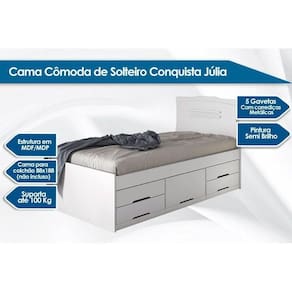 Imagens Meramente Ilustrativas. Não nos responsabilizamos pela montagem/instalação dos produtos. Todas as informações divulgadas são de responsabilidade exclusiva do fabricante/fornecedor. Tamanho do Colchão Indicado: Solteiro 88x188 | Tamanho da Cama: Solteiro | Quantidade de Gavetas: 5 | Quantidade de Prateleiras: 1 Prateleira | Tipo de Pintura: Ultravioleta | Tipo de Acabamento da Pintura: Semi Brilho | Material de Estrutura: MDF/MDP | Tipo de Corrediça: c/ Corrediças Metálicas | Garantia: Garantia de 90 Dias | Certificação de Qualidade: Qualidade Aprovada | Código universal de produto (GTIN): 78997013970006 | Produto precisa de Montagem?: Sim, a montagem é simples mas sugerimos a contratação do nosso serviço de montagem (para os CEPs em que o serviço está disponível) ou de algum experiente de sua preferência | Descrição do Tamanho: 105.00x:98.00x193.00 cm | Estado de Origem: RJ | País de origem: Nacional | Peso Produto Com Embalagem (Kg): 59.75 | Material para Filtro: N/I | Cor Mobly: N/I | Condição do Item: | Link Site: https://www.costaricacolchoes.com.br/produtos/35249S3315/ | Numeral: 0 | Não se Aplica: N/A | Não Possui: Não | Linha/Modelo: Conquista | Cor Cnova: Branco | Cor Meli: Branco | Contatos Sac Fábrica: cr@conquistamoveis.com.br | Categoria - Sub: Cama de Solteiro | Categoria - Pai: Quarto Juvenil e Solteiro | Comnto Embalagem: 193.00 | Largura Embalagem: 45.00 | Altura Embalagem: 31.40 | Peso: 59.75 Kg | Kit: 0 | Peso Real Kg: 59.75 | Peso Cubado: 27.50 | Volumes: 3 | M3: 0.11 | Comnto/Profundidade: 193 cm | Largura: 98 cm | Altura: 105 cm | Tamanho Montado: Larg:98.00 x Comp/Prof:193.00 x Alt: 105.00 | Comnto/Profundidade Montado: 193.00 | Largura Montado: 98.00 | Altura Montado: 105.00 | MPN: 9812.3 | Cor Fabricante: Branco | Marca: Conquista | Fabricante: Conquista | Linha: Conquista