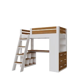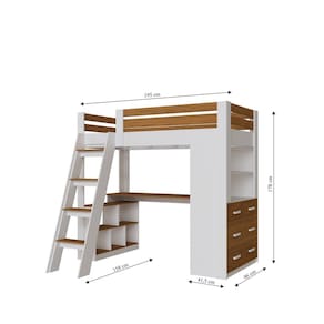Além de possuir um visual moderno, que combina com os mais variados tipos de decoração, esse móvel incrível conta com uma escada frontal, uma cama superior com grade de proteção, para um maior conforto e segurança, uma escrivaninha com amplo espaço de bancada, para estudos e trabalho, cinco nichos laterais abertos, para acomodar objetos diversos e dispõe de seis espaçosas gavetas, com corrediças telescópicas, para armazenar desde livros a vestuários. Aproveite!