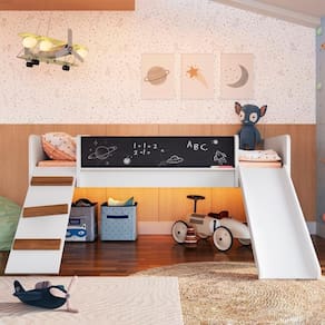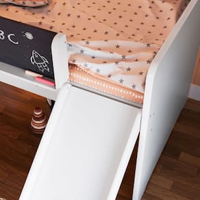 A Cama Playground Com Escorregador E Rampa é perfeita para que seus filhos tenham grandes aventuras em pouco espaço. Estrutura em MDP de 15 mm, e excelente acabamento em Finish Foil (Fosco). Ela é composta por um escorregador, uma rampa, um painel na cor preta aonde a criançada pode desenhar e escrever o que quiser e melhor ainda, acompanha giz colorido. Acompanha sapatas plásticas. O colchão indicado é de 188x78 (Não Acompanha Colchão). A cama playground suporta até 50 kg distribuídos. Com resistência mecânica, permitindo que a brincadeira seja segura, sem riscos de quedas ou afrouxamento dos componentes. Este móvel chegará em sua casa separado em 03 volumes.