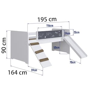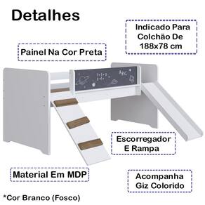 A Cama Playground Com Escorregador E Rampa é perfeita para que seus filhos tenham grandes aventuras em pouco espaço. Estrutura em MDP de 15 mm, e excelente acabamento em Finish Foil (Fosco). Ela é composta por um escorregador, uma rampa, um painel na cor preta aonde a criançada pode desenhar e escrever o que quiser e melhor ainda, acompanha giz colorido. Acompanha sapatas plásticas. O colchão indicado é de 188x78 (Não Acompanha Colchão). A cama playground suporta até 50 kg distribuídos. Com resistência mecânica, permitindo que a brincadeira seja segura, sem riscos de quedas ou afrouxamento dos componentes. Este móvel chegará em sua casa separado em 03 volumes.