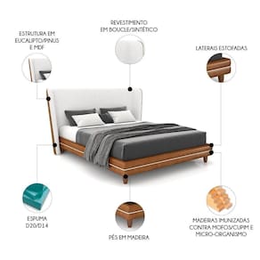 Sua estrutura é fabricada em madeira reflorestada, unindo pinus, eucalipto e MDF, tratados especialmente contra mofo, cupim e micro-organismos. O travamento estrutural é assegurado por grampos, fixados com grampeadores pneumáticos, o que garante resistência e uma vida útil prolongada. A Cabeceira e a Base Box possuem estofamento em espuma D-20 e D-14, proporcionando um conforto único. Com revestimento de altíssima qualidade, essa Cama é ideal para noites de sono revigorantes e momentos de relaxamento. Além disso o design bipartido da base facilita tanto o quanto a montagem, tornando tudo mais eficiente. Os pés em madeira conferem charme e elegância, elevando a decoração do seu Quarto Casal com um toque acolhedor e repleto de estilo.