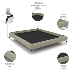 Características do Produto Material da estrutura: Madeira de Eucalipto/MDF 6mm. Densidade da Espuma: Espuma D20/D14. Peso Suportado: 250 Kg. Revestimento: Linho. Possui Pés: Sim. Material dos Pés: Ferro. Altura dos Pés: 13cm. Possui Rodízios: Não. É Bipartido: Sim. Acompanha Colchão: Não. Acompanha Cabeceira: Não. Diferenciais: - Design moderno. - Lateral estofada. - Pés de ferro. Sistema de Montagem: Parafusos. Manual de Montagem: Não. Complexidade da Montagem: Baixa. Conteúdo da Embalagem: 1 Cama. Volumes: 2 Volumes. Garantia do Fabricante: 90 dias contra defeitos de fabricação. Montagem: Recomendamos que seja feita por um profissional. Recomendação de limpeza: Utilize pano levemente úmido.