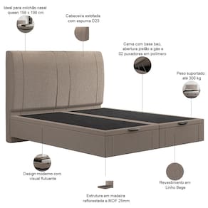 Cama com base baú, abertura pistão a gás e excelente espaço de armazenamento.